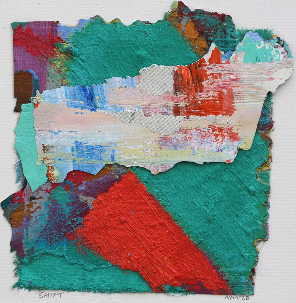Shift, above, is one of the small oil paint collages made during recent lockdowns when he began to reassess and then destroy some work: “A feeling of wanting to move away from the norm of the rectangular or square format and embrace a more irregular, three dimensional form was the impetus. Collage became a process of reforming, rebuilding.”