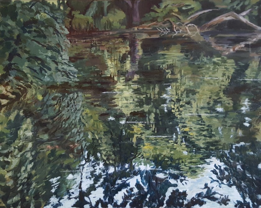The meeting came about at a summer painting retreat which Jenny regularly organises in Devon. The moorland rivers, especially the Teign, inspired many of their paintings, as did the Heath ponds. For Jenny, “motifs that incorporate looking across water are symbolic of journeying, travelling through space and time imaginatively and emotionally”.