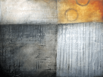 Dr Nock’s explanation is more challenging but still illuminating: “Painting evokes a temporal and psychological crossing that travels far into one’s depths to retrieve a neglected longing. Sedimentation implies the idea of a work of art, not as a final product in itself but as relics of events or as a process of thought. The ceaseless piling up of broken splintered text becomes a means of ordering, disordering and unravelment. Unsubstantial traces cross surfaces and become subordinate to immaterial fragmented thoughts.”