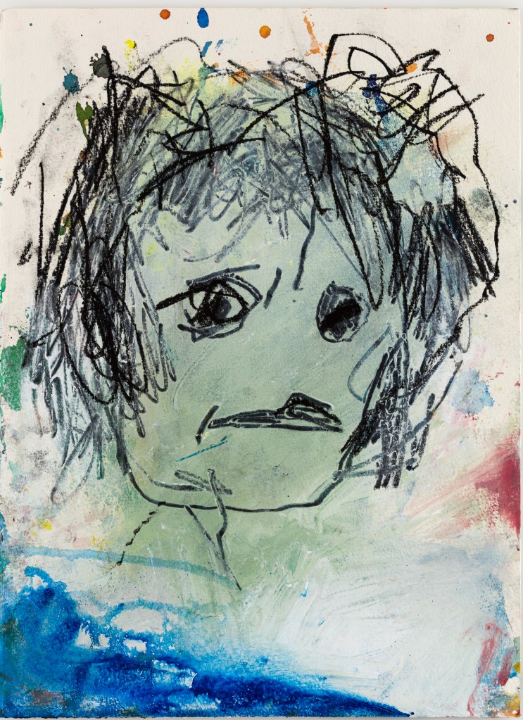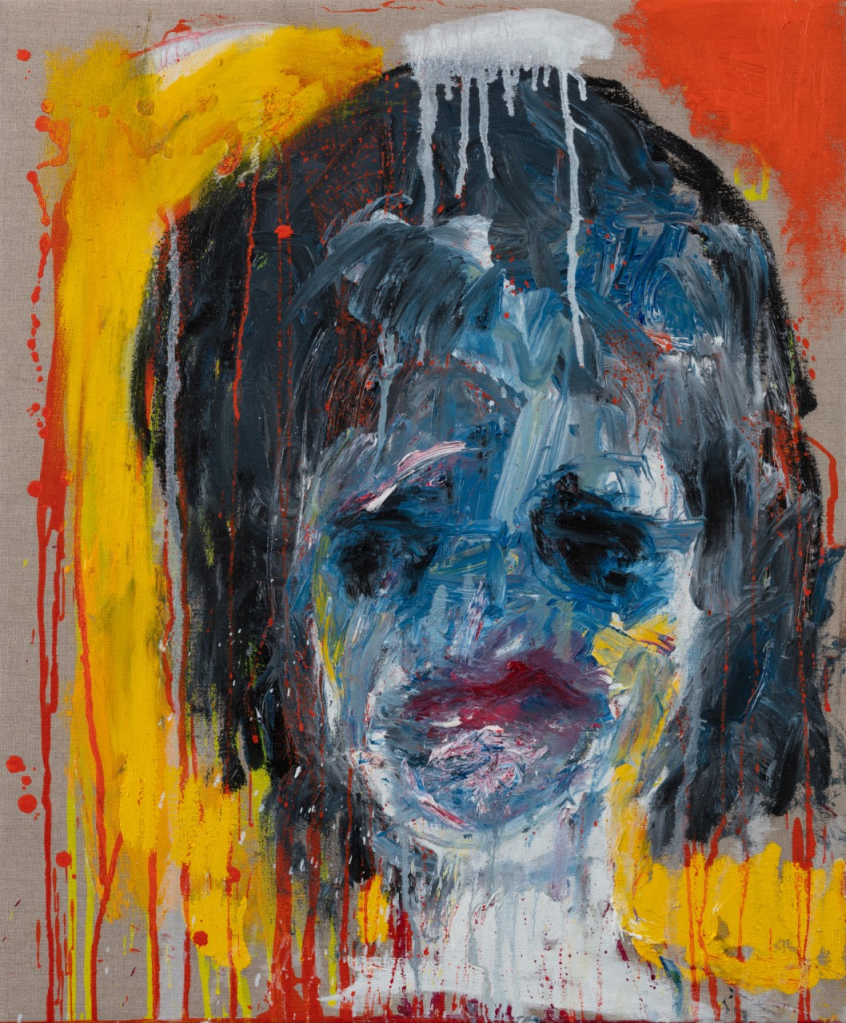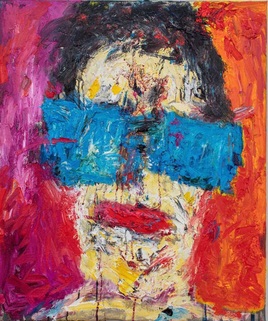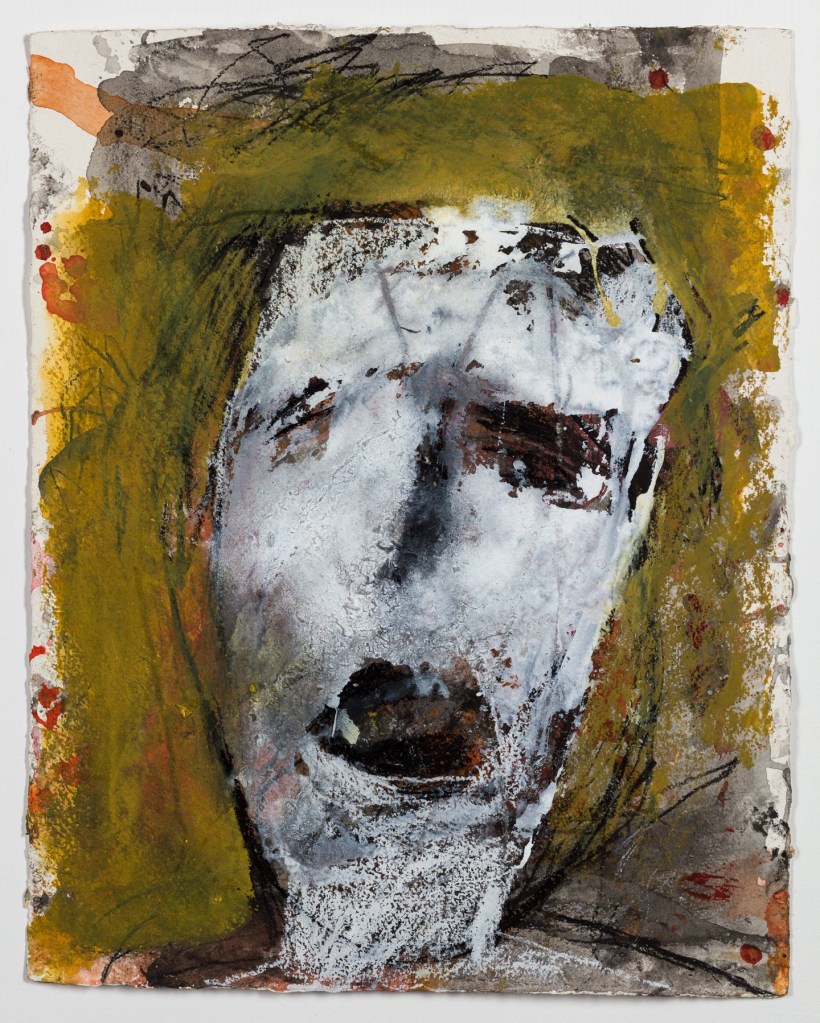 In a perspicacious catalogue essay for Blane’s exhibition at Burgh House in the Spring, the critic Sue Hubbard observed “There’s a physical savagery to her mark-making, as if stirring her images out of the ether by spells and incantations.” She says her heads “reverberate like Bacon’s furious, screaming Popes” and “dense, scribbled and blotted images…. brazen scarlet and bile-yellow blotches (have) an anarchic, chthonic sensuality”.