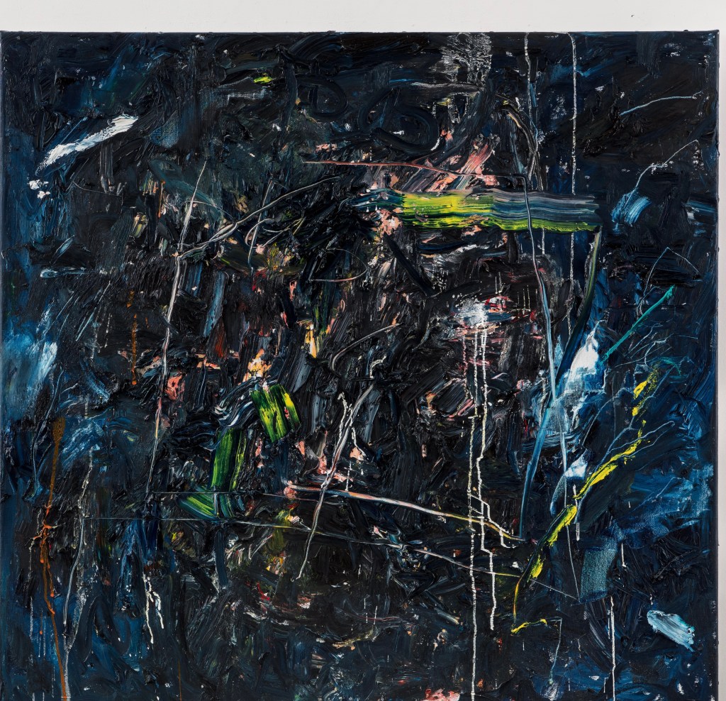 Govinda sees Blane’s allegiance as being to Freud: “She excavates the struggling fury with the human self, colour is aggressively applied without formal shapes or boundaries.” His descriptions are perceptive. Of the work illustrated here he says Blue Black Head is unsettling, “awash with intense, scribbling vivid colours” and Blue conveys “a far more tranquil inner landscape, like a musical interlude, a calm between storms”.