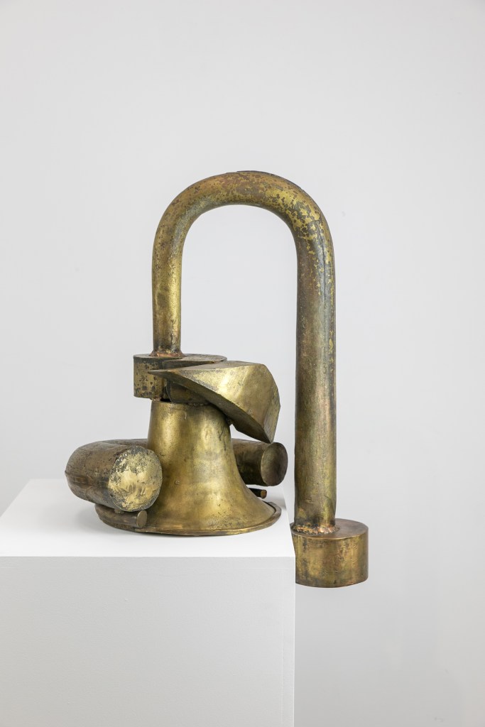 The Annely Juda exhibition highlights the importance of music as an influence on Caro’s sculpture and includes works from the Concerto series of the late 1990s and early 2000s, including Crescendo (below). The perspicacious catalogue essay by Paul Moorhouse explains that Caro amassed discarded instruments including a French horn, a trumpet and a euphonium which he prized for their expressive shapes and the material from which they were made.