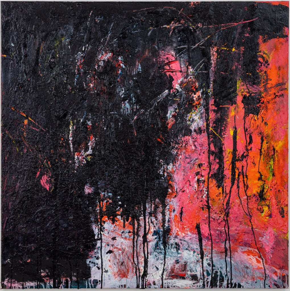 When I asked her to describe her intentions she did so succinctly: “I was interested in dividing up the picture plane in an apparently balanced way whilst disrupting the format with rectangles and edges in shifts up or down. In the way that rectangles in a Rothko seem to move up and down and in a Reinhardt in and out.” The key features for me were the intense texture of the black paint and fizzing energy of the broken red lines, both only to be discerned at close quarters to the canvas, hence the urge to take it home.